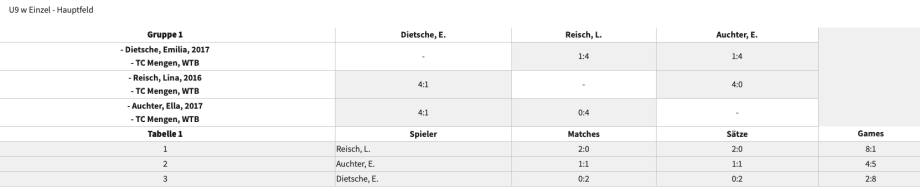 Bei den JKMs in der Kategorie U9 weiblich gab es 3 Teilnehmerinnen, die alle vom TC Mengen waren. Nach 3 tollen Matches konnte sich die älteste im Feld, Lina Reisch gegen ihre beiden