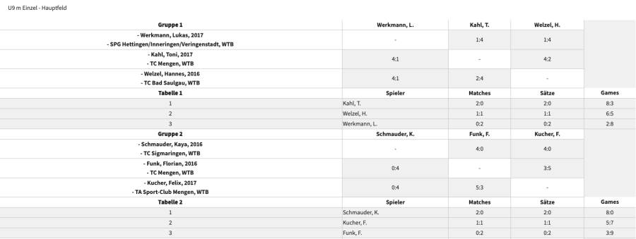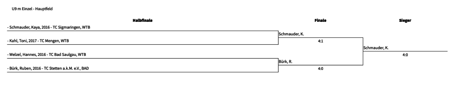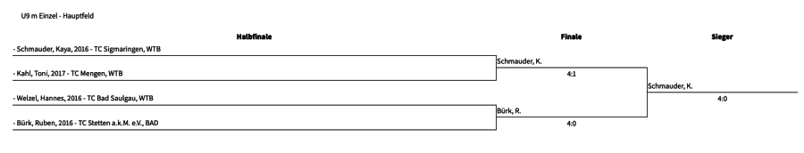Bei den JKMs in der Kategorie U9 männlich war der Teilnehmerandrang groß. Insgesamt 9 Teilnehmer aus Stetten, Bad Saulgau, von der SPG Hettingen/Inneringen/Veringenstadt, Sigmaringen, vom SC Mengen und TC Mengen standen sich in 3 Gruppen im Hauptfeld gegenüber. Die 3 Gruppensieger plus der beste Zweitplatzierte standen sich dann im Halbfinale gegenüber, bei denen sich Kaya Schmauder (Bild) und Ruben Bürk gegen ihre Konkurrenten Hannes Welzel und Toni Kahl durchsetzen konnten. Das Finale Schmauder gegen Bürk endete 4:0 für den Sigmaringer, der sich somit zum Kreismeister kürte.